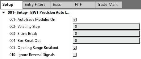 Section 001 of this tab is used to turn on the different trading modules. A trading module is logic that tell the AutoTrader when to take a trade.